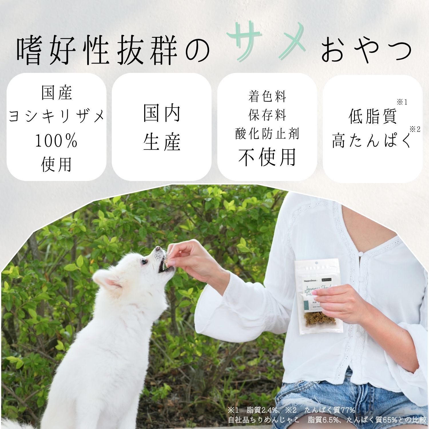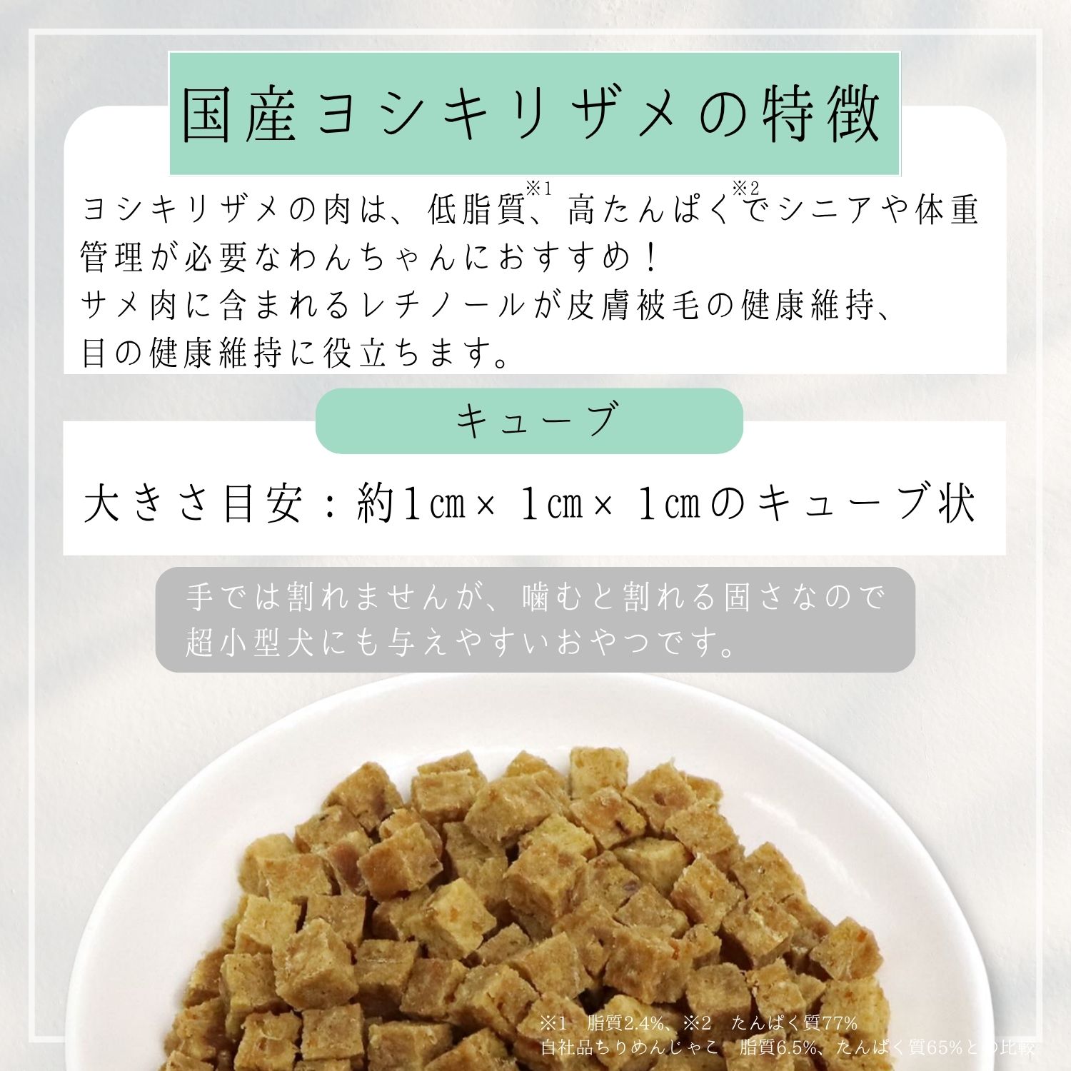 ヨシキリザメの肉は、低脂質、高たんぱくでシニアや体重管理が必要なわんちゃんにおすすめです。サメ肉に含まれるレチノールが皮膚被毛の健康維持、目の健康維持に役立ちます。 手では割れませんが、噛むと割れる固さなので超小型犬にも与えやすいおやつです。 着色料や保存料、酸化防止剤などの添加物不使用。