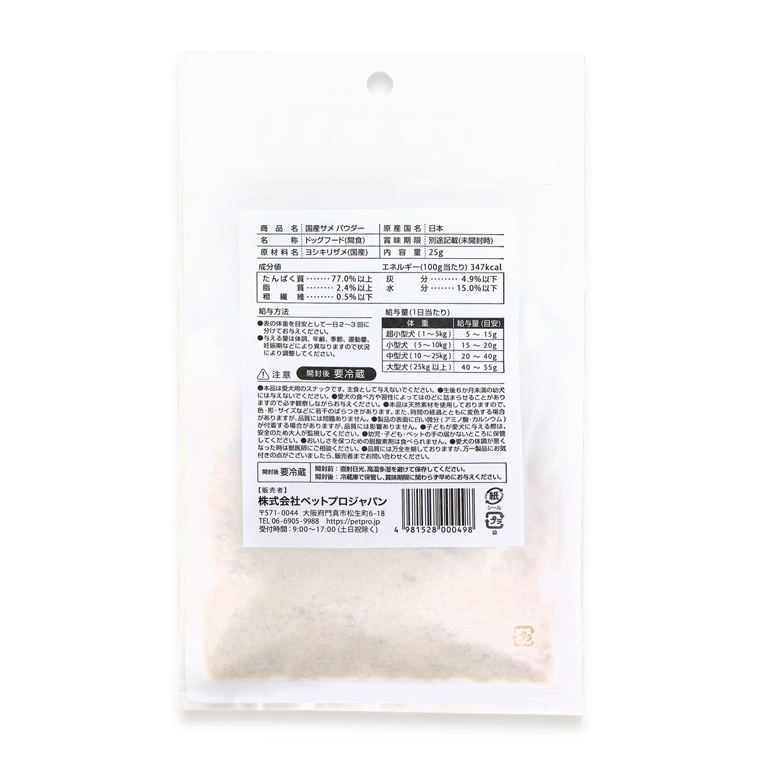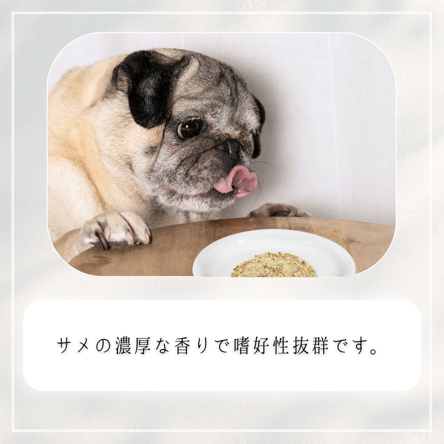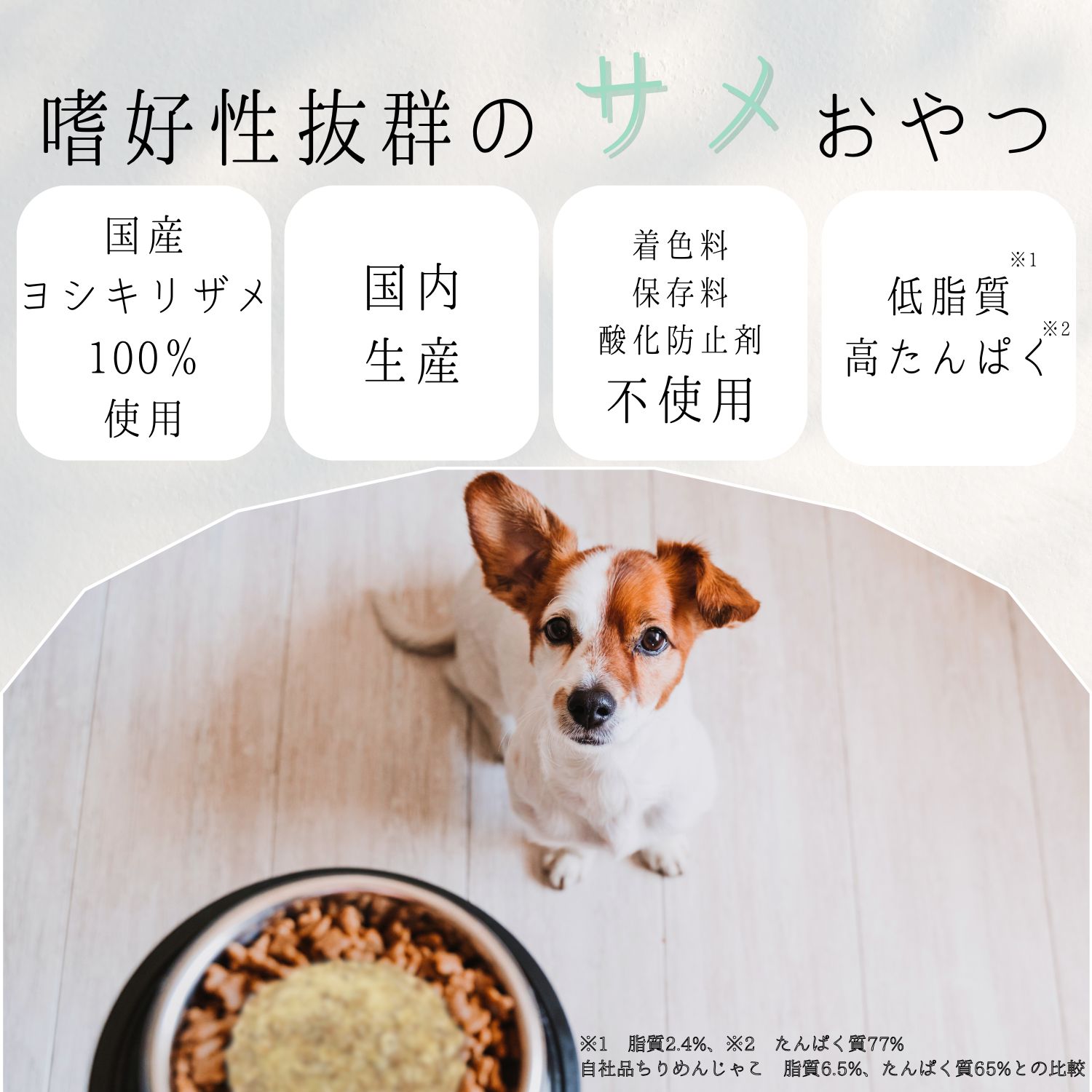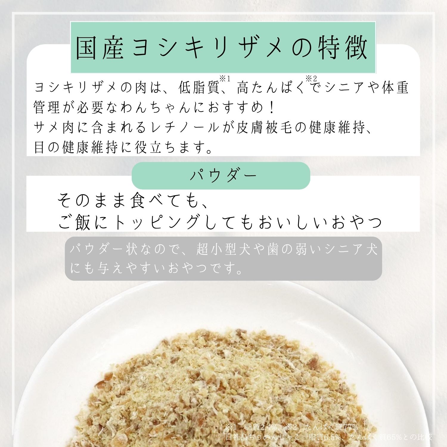 ヨシキリザメの肉は、低脂質、高たんぱくでシニアや体重管理が必要なわんちゃんにおすすめです! サメ肉に含まれるレチノールが皮膚被毛の健康維持、目の健康維持に役立ちます。 そのまま食べても、ご飯にトッピングしてもおいしいおやつです。パウダー状なので、超小型犬や歯の弱いシニア犬にも与えやすいおやつです。 着色料や保存料、酸化防止剤などの添加物不使用。