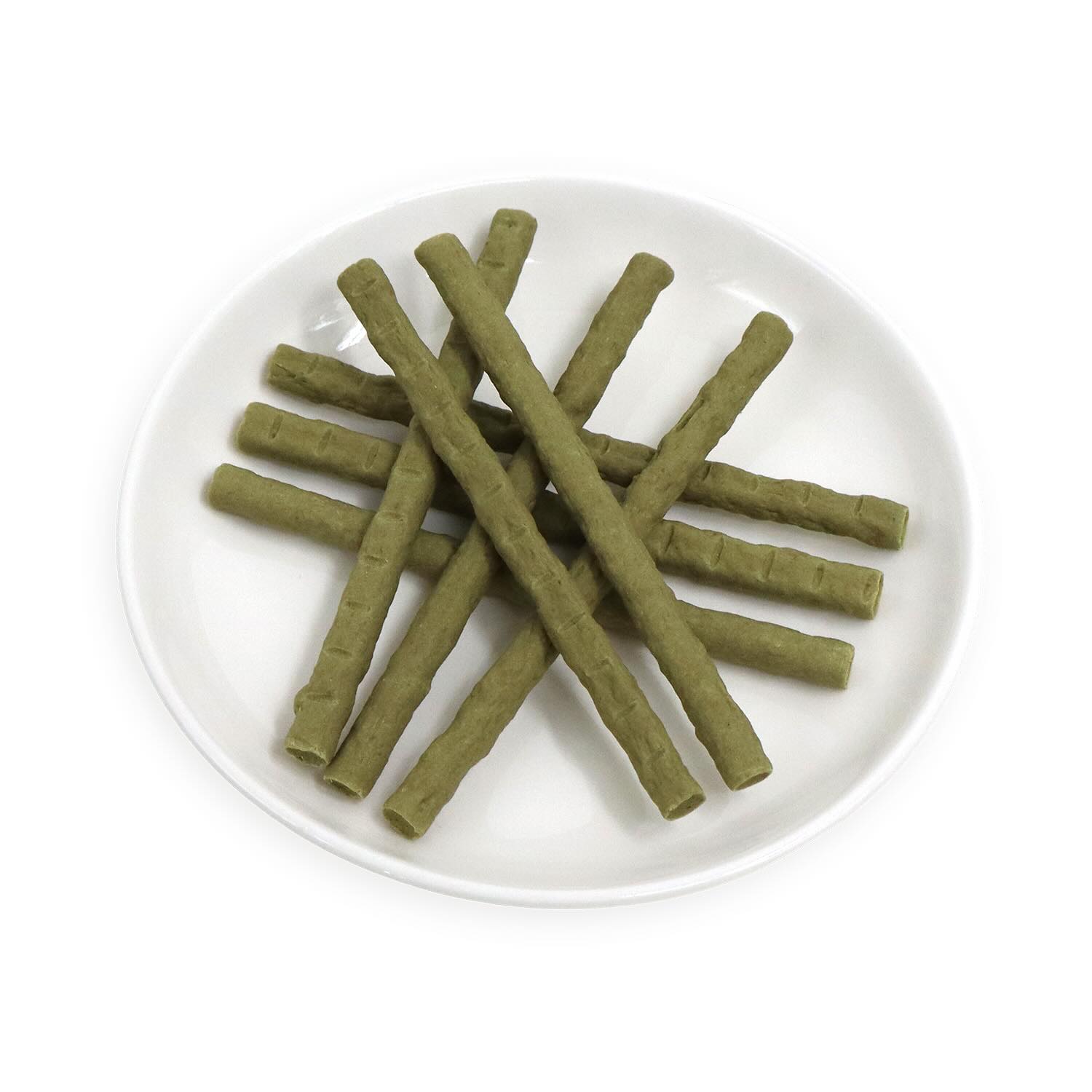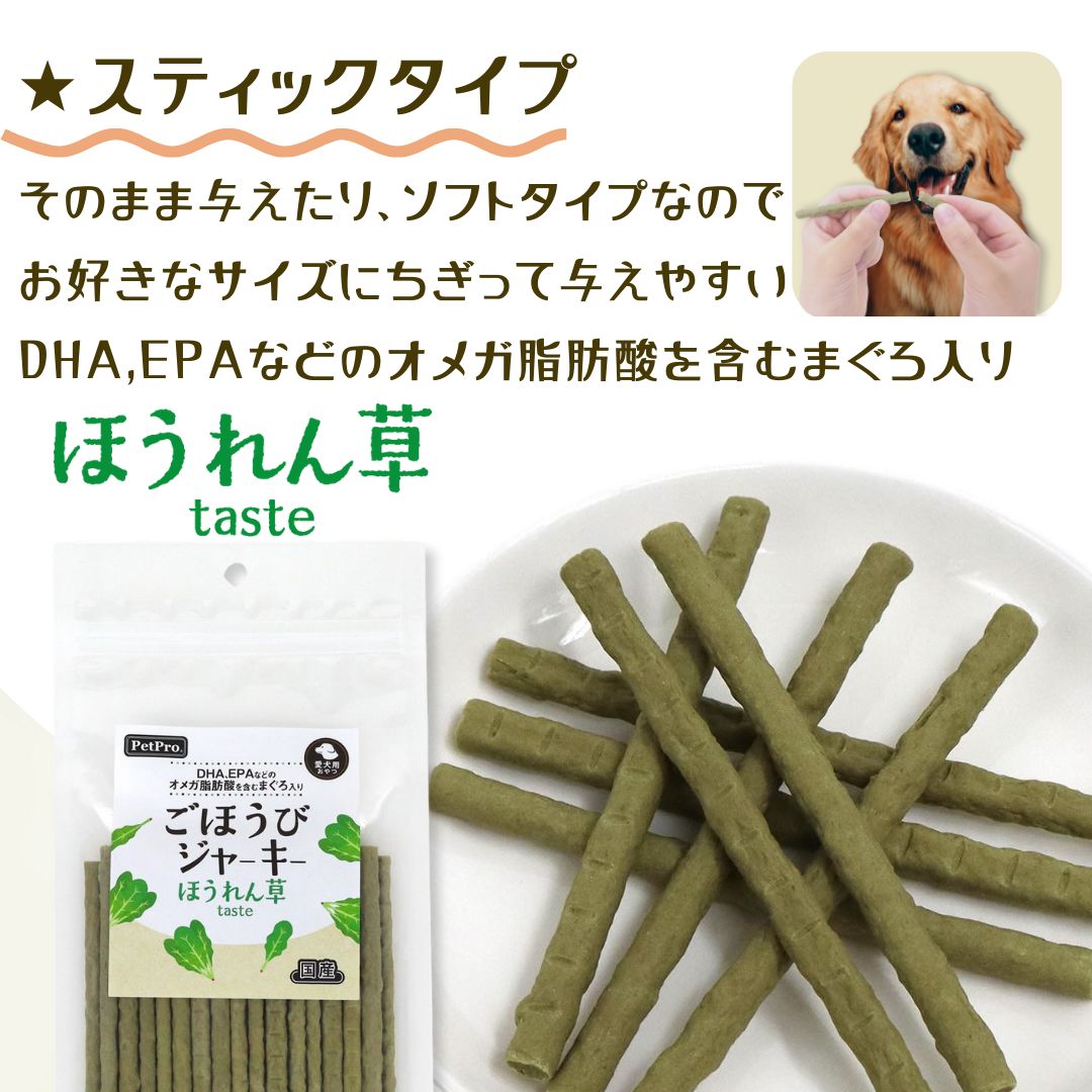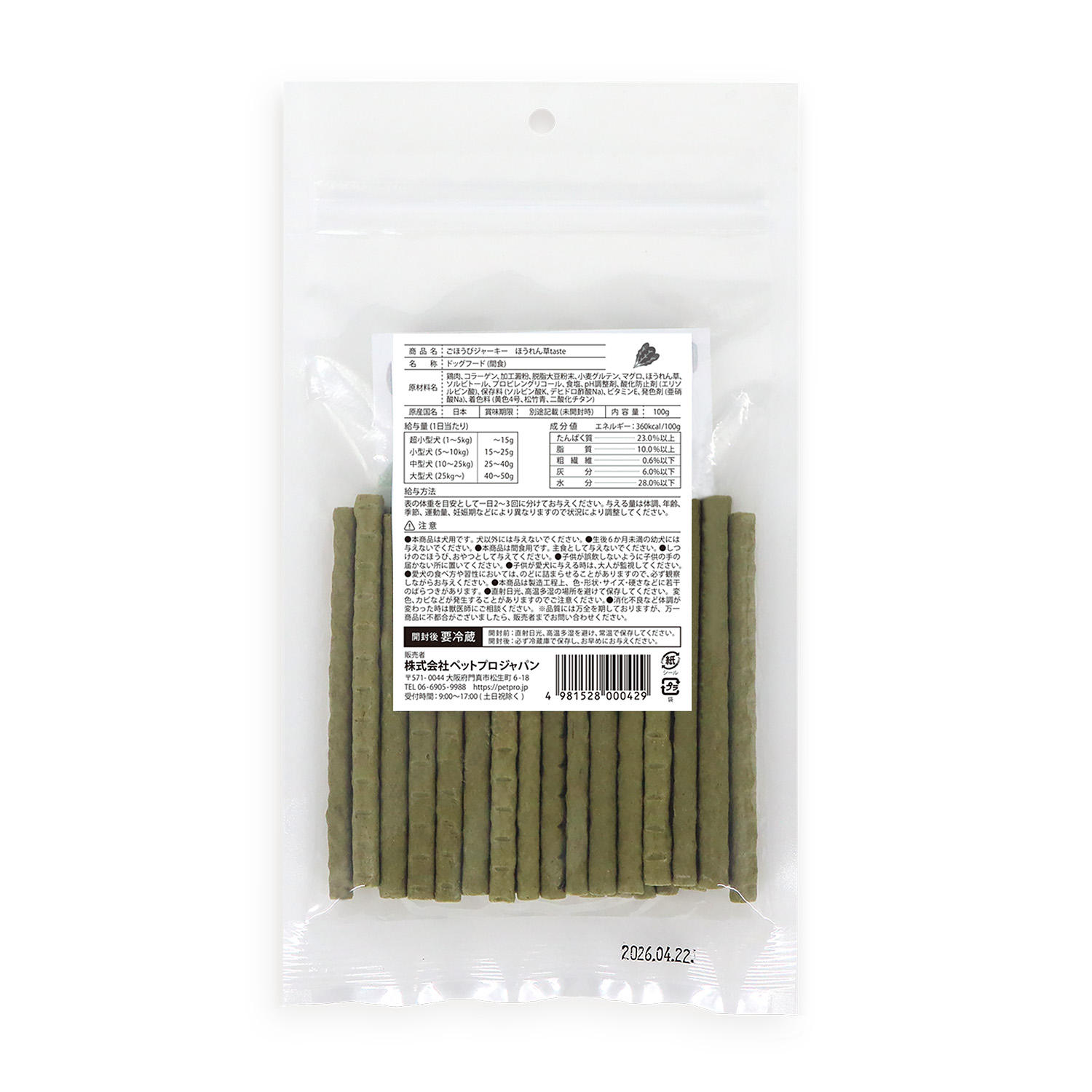 与えやすいスティックタイプ、ほうれん草tasteのワンちゃん用おやつ。