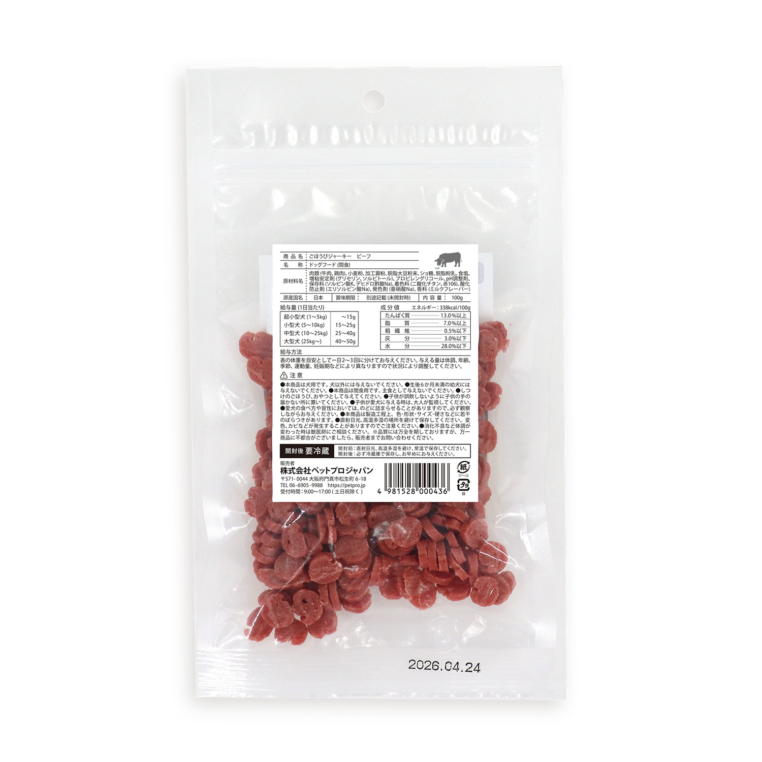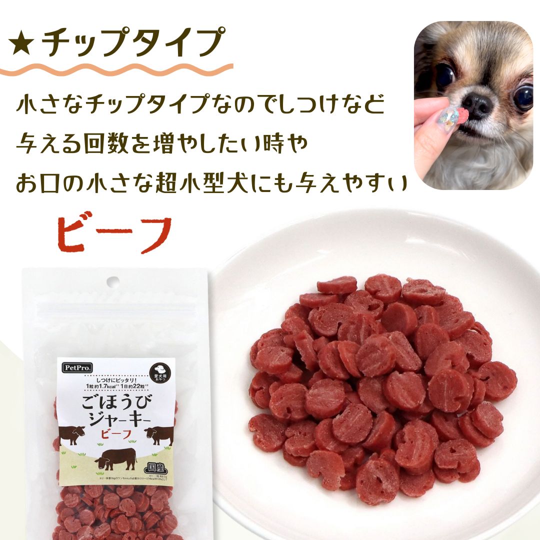 与えやすいチップタイプ、ビーフのワンちゃん用おやつ。※体重5㎏の必要カロリー374kcalの10%として