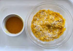 ①キャロブパウダー以外の粉類・乾燥素材(米粉、アーモンドパウダー、おからパウダー、片栗粉、野菜フレーク)と牛乳以外の液体(卵黄、サラダ油、はちみつ)をそれぞれ混ぜておきます。
