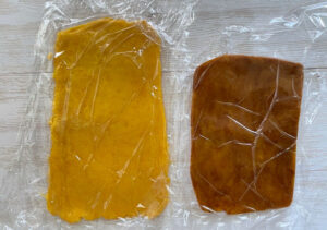 キャロブパウダーで色づけたほうは1㎜くらいに細く切り、縞柄になるよう指で押し付けます。