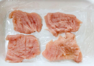 ②鶏むね肉は厚みを半分になるように開き、さらに4等分します。