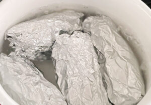 沸騰したら弱火にし、8分ほど加熱します。火を止めたらそのまま5~10分ほど置き、余熱で火を通します。鍋から取り出し、ラップとアルミホイルを外します。